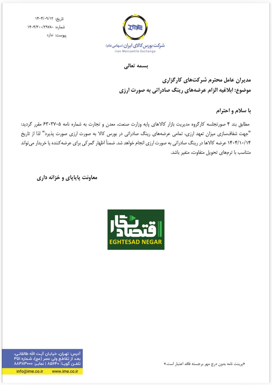 به گزارش اقتصادنگار، بر اساس ابلاغیه جدید بورس کالای ایران، تمامی عرضههای رینگ صادراتی از ۱۴ دی ۱۴۰۴ فقط بهصورت ارزی انجام خواهد شد. این تصمیم که مطابق بند چهارم صورتجلسه کارگروه مدیریت بازار کالاهای پایه وزارت صمت اتخاذ شده، با هدف شفافسازی میزان تعهدات ارزی عرضهکنندگان اجرایی میشود.
