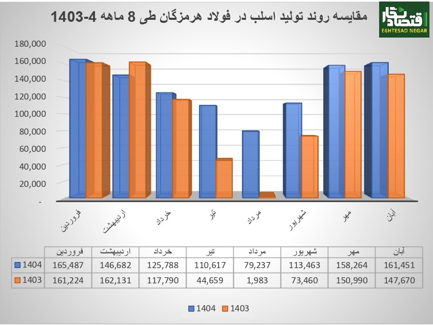 در ماههای مهر و آبان، فولاد هرمزگان موفق شده تولید خود را در سطح بالایی تثبیت کند. تولید آبان ۱۴۰۴ با ثبت بیش از ۱۶۱ هزار تن، بالاترین رقم در این دوره محسوب میشود و نشاندهنده عملکرد پایدار و برنامهریزی دقیق عملیاتی است.
