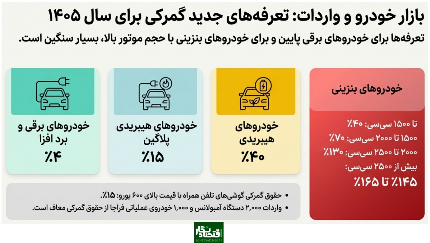 تعرفههای جدید گمرکی برای سال ۱۴۰۵ اعلام شد و بر این اساس تعرفهها برای خودروهای برقی پایین و برای خودروهای بنزینی با حجم موتور بالا، بسیار سنگین است.
