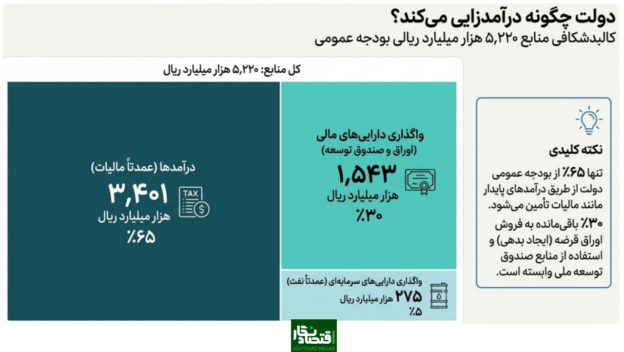 ۳۰ درصد درآمد دولت به فروش اوراق قرضه (ایجاد بدهی) و استفاده از منابع صندوق توسعه ملی معادل ۱۵۴۳ هزار میلیارد ریال وابسته است.