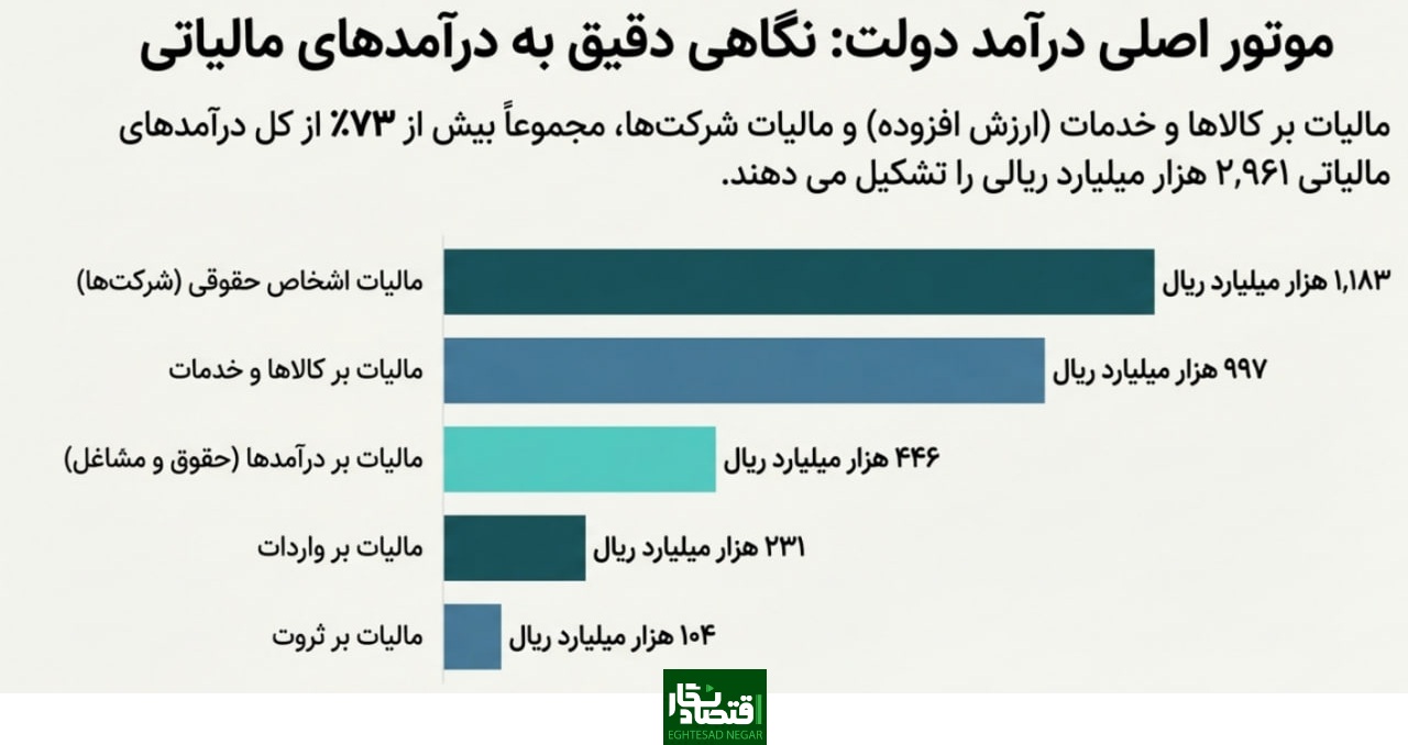 مالیات بر کالاها و خدمات (ارزش افزوده) و مالیات شرکتها، مجموعه بیش از ۷۳ درصد کل درآمدهای مالیاتی ۲۹۶۱ هزار میلیارد ریال را تشکیل میدهد.