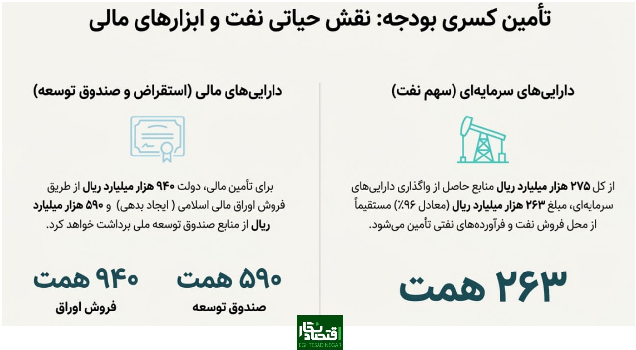 برای تامین مالی، دولت ۹۴۰ هزار میلیارد ریال از طریق فروش اوراق مالی اسلامی (ایجاد بدهی) و ۵۹۰ هزار میلیارد ریال از منابع صندوق توسعه ملی برداشت میکند.