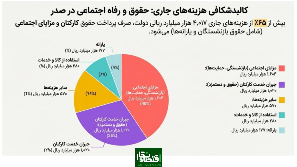 بیش از ۶۵ درصد هزینههای جاری دولت ۴۰۱۷ هزار میلیارد ریال دولت، صرف پرداخت حقوق کارکنان و مزایای اجتماعی است.