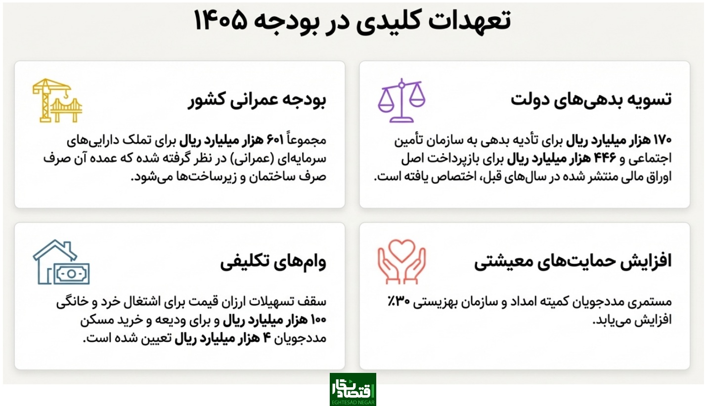 مهمترین تعهدات دولت در بودجه ۱۴۰۵ شامل تسویه بدهیهای دولت، بودجه عمرانی کشور، افزایش حمایتهای معیشتی و وامهای تکلیفی است.