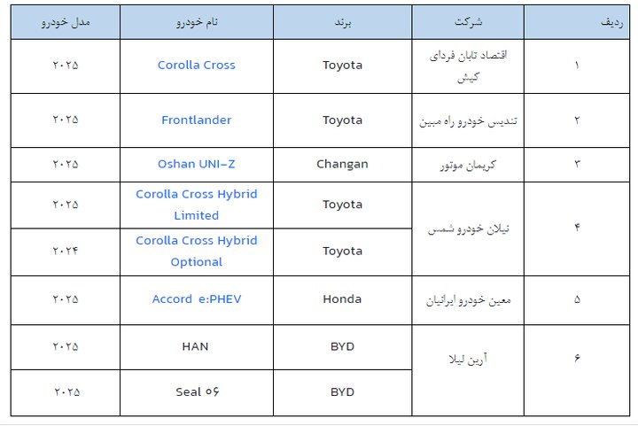 این دور از عرضه شامل شش خودرو به شرح ذیل است: